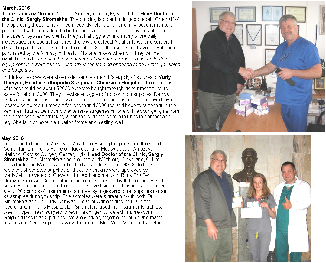 MedWish receives major contributions of supplies from large hospitals, clinics, and medical suppliers. They make these supplies available at very low cost to approved humanitarian organizations. GSCC was approved in April and I carried a suitcase full of instruments and supplies to Ukraine in May. We work with hospitals I know and have a personal relationship with to make sure that everything that goes there is used to the benefit of the patients at no cost to them. |